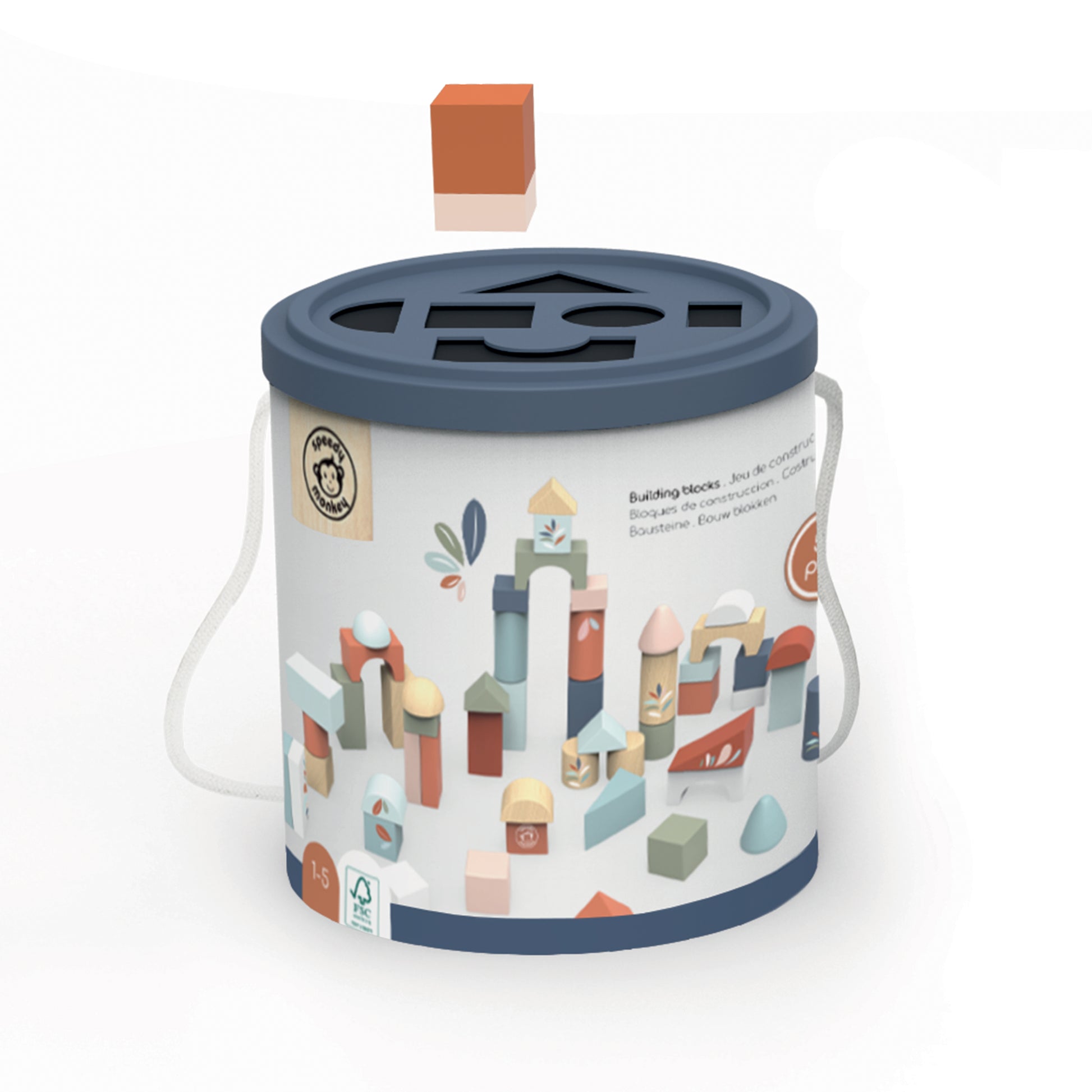 The building block set containing 50 Colourful wooden building blocks for toddlers, remains indispensable for apprenticeship hand-eye coordination. Blocks consist of a variety of shapes, printed with pretty leaves, encouraging your little ones to freely use their imagination to build, whilst stimulating sensory development. The blocks come in a sturdy, round bucket with a handle and shape sorter lid making pack up time much more fun! This toy is crafted from sustainably sourced wood from FSC® certified forests and coated with non toxic paint.